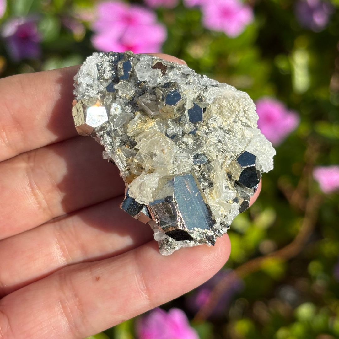 Clear Quartz with Pyrite is a powerful combination of two high-energy crystals, blending the amplifying properties of Clear Quartz with the protective and manifesting abilities of Pyrite. This duo creates a strong vibrational synergy that supports clarity, abundance, and energetic protection.