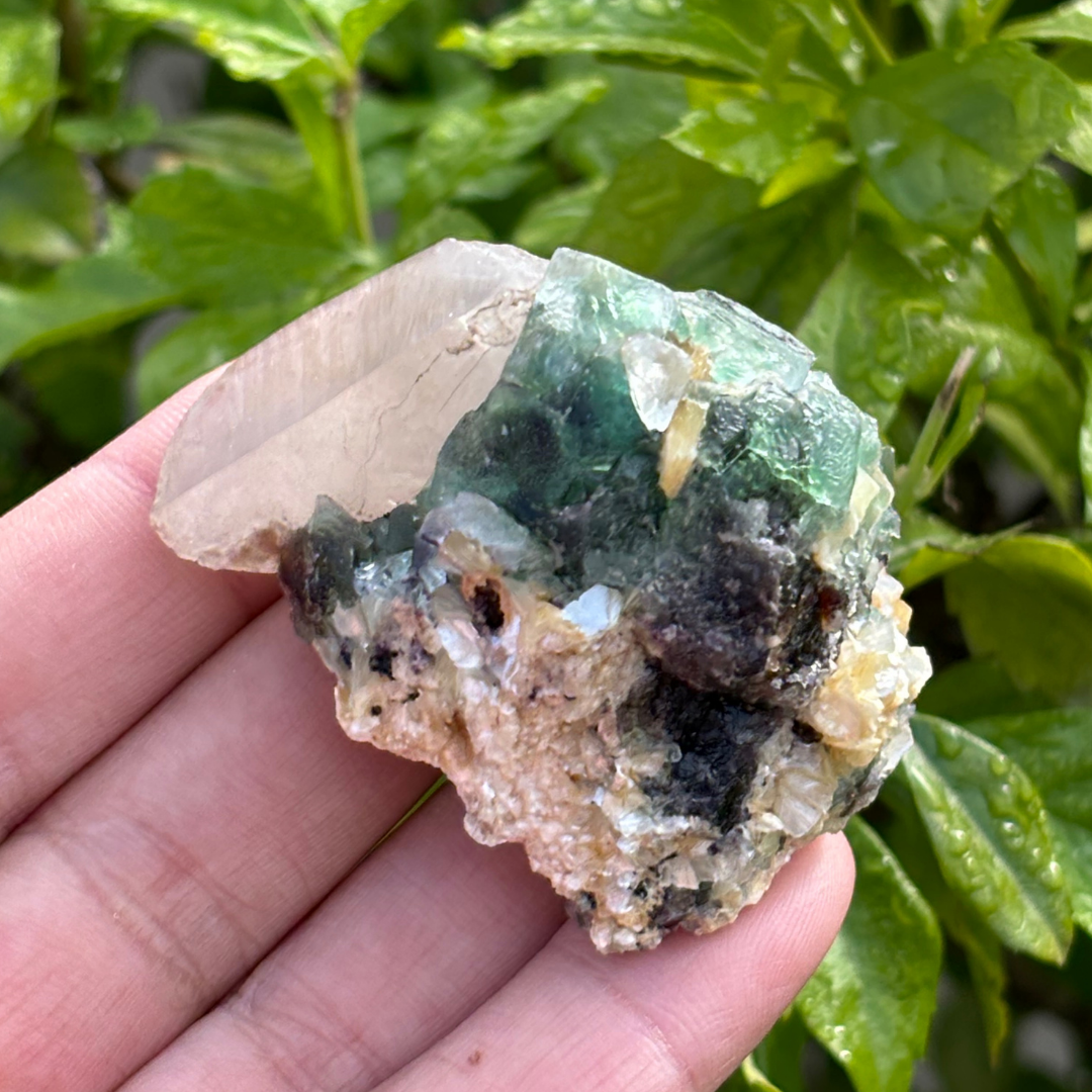 - Green Fluorite Crystals with some Purple Tips, Quartz, Muscovite & Schorl