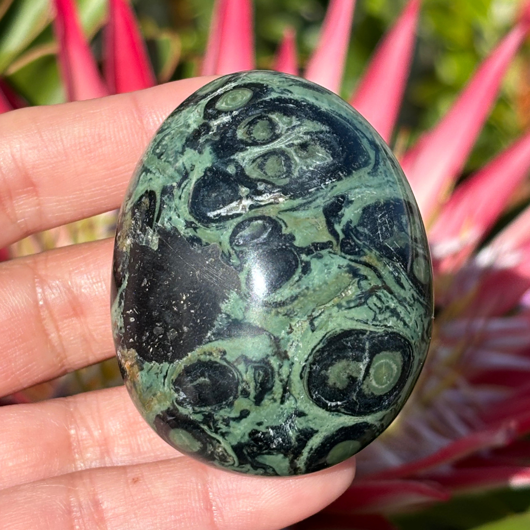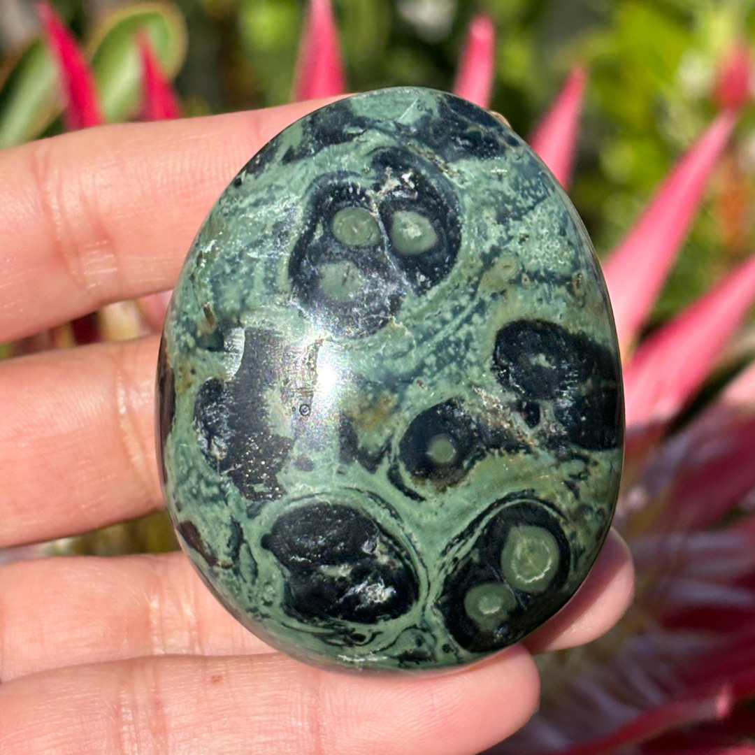 Kambaba Jasper is a stone of peace, tranquility, and fertility. It reminds us of the gift of life and our connection to all living things of the present, past & future. Rich in orbs and swirls of green and black, meditating with Kambaba Jasper will help strengthen your connection to the outside world, as well as becoming more connected to the people and animals within it.
