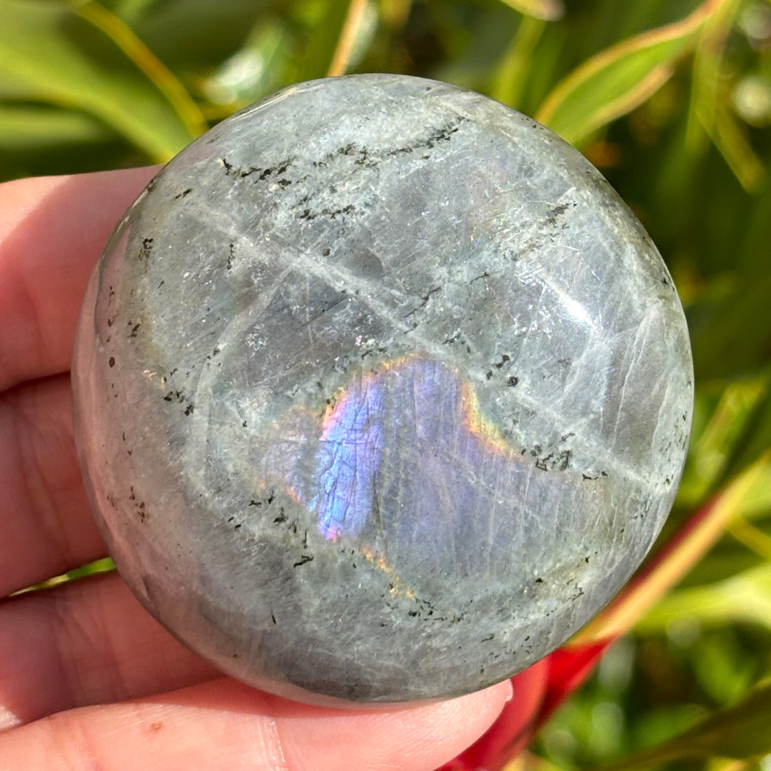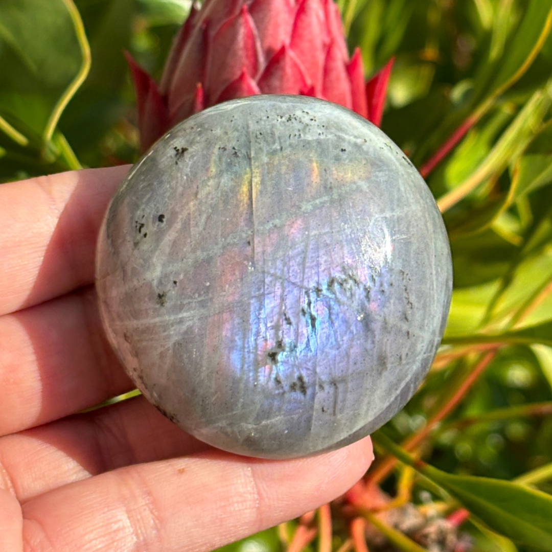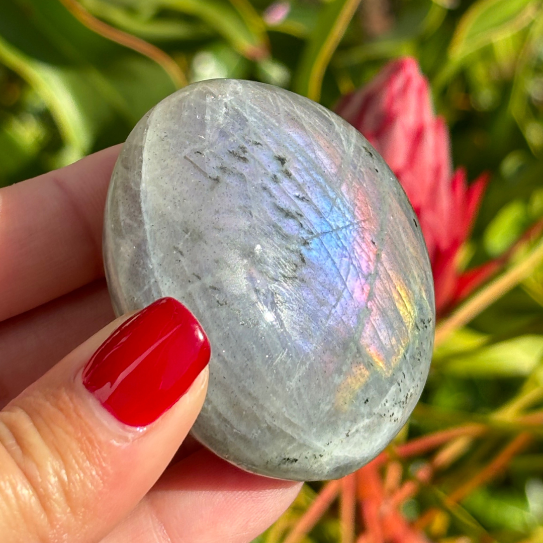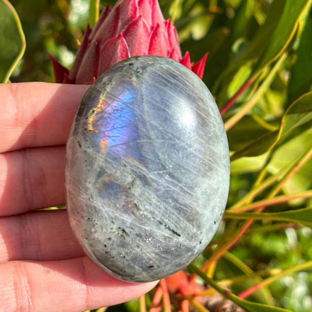 - Labradorite Purple Pink Palm Stone (Purple, Pink, Orange & Blue Flash)