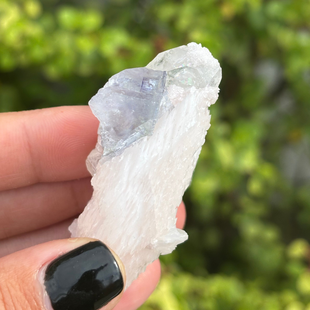 - Purple Blue Fluorite with Calcite & Quartz Specimen (as pictured) Calcite glows pink under UV