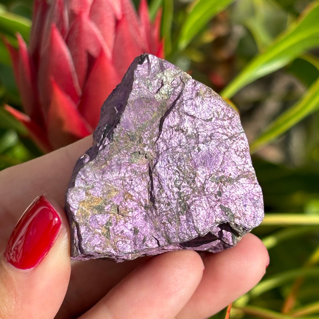 Purpurite resonates with the Violet Ray stimulating the Crown Chakra and increasing spiritual aspirations. Purpurite is a powerful ascension tool that helps attune one to higher energies, as well as open up and connect the third eye and crown chakra. Working with this mineral will help raise ones intuition levels and consciousness, as well as assisting one in the understanding of this new found powerstone. Purpurite will help one adjust and become more comfortable with the energy being channeled through your mind and into your third eye. Using and wearing this stone frequently can cause one to have inner visions about their current life path.